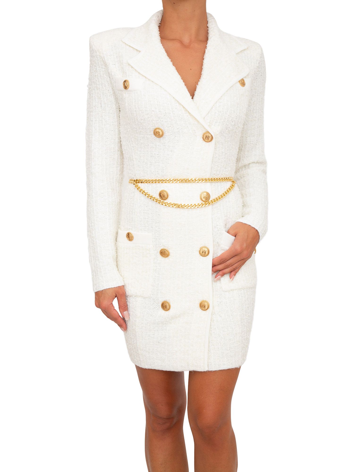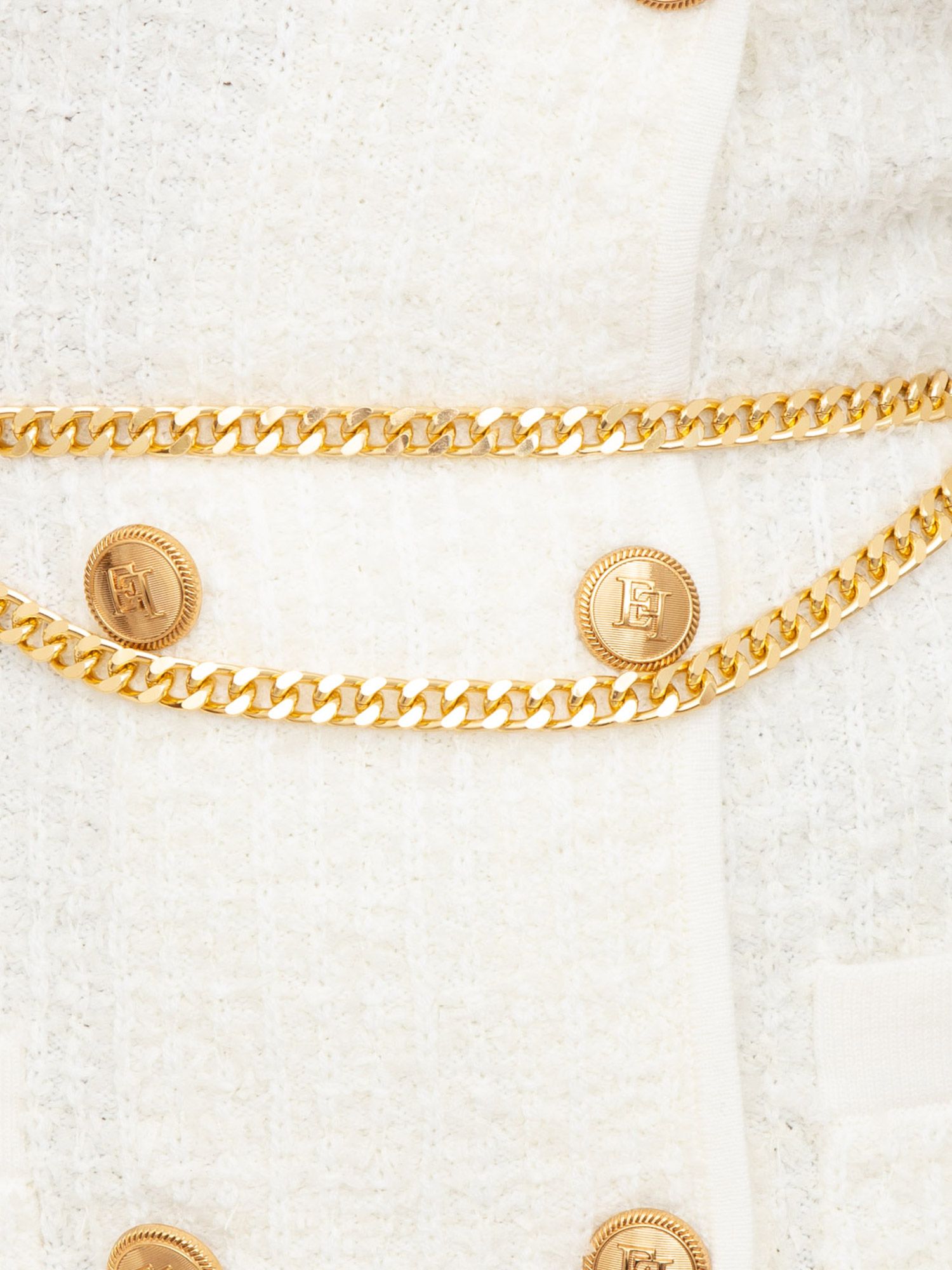 Robe-manteau Elisabetta Franchi in jacquard trasportato con maniche lunghe e abbottonatura vera. Il punto vita è enfatizzato da una cintura in metallo dorato anticato e tasche con bottoni logati.