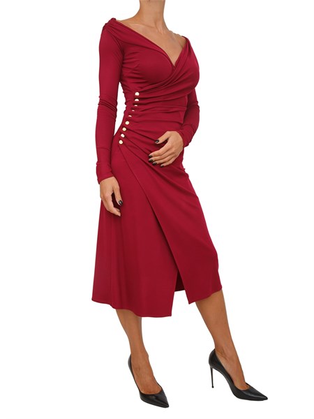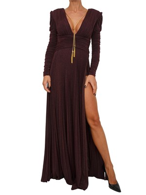 Abito da sera Elisabetta Franchi in jersey lurex dalla vestibilità aderente. Il vestito ha spalle strutturate con scollo profondo, maniche lunghe e gonna plissé con spacchi laterali. Si distingue per i drappeggi che incorniciano il busto e il punto vita. Dettaglio gioiello amovibile, in catena con logo e nappine. La modella è alta 1.72 e indossa la taglia 40.