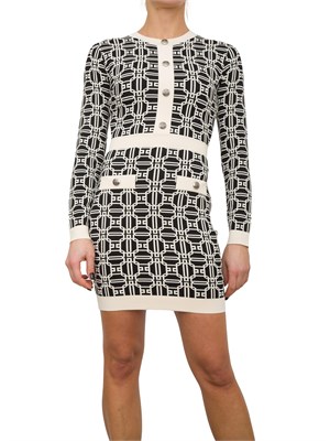 2. Miniabito Elisabetta Franchi realizzato in misto viscosa stampa logo jacquard a maniche lunghe con scollo a giro. È caratterizzato da finta abbottonatura e finiture in contrasto colore. La sua vestibilità che enfatizza la silhouette lo rende perfetto sia per look da sera che per look casual da tutti i giorni, donando un tocco di femminilità sensuale ed elegante.