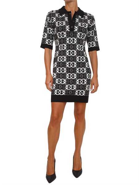 Miniabito Elisabetta Franchi modello dolcevita realizzato in misto viscosa a maniche lunghe rifinite da bottoni in metallo dorato. È caratterizzato da stampa logo jacquard e finiture in contrasto colore. Vestibilità che segue la silhouette enfatizzando la femminilità e sensualità. Perfetto per ogni tuo look formale, serale o casual.