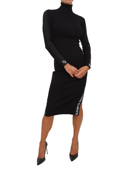 Abito Elisabetta Franchi in neoprene dalla vestibilità aderente. Il vestito ha maniche con spacchi al fondo e si distingue per i richiami al mondo della corsetteria, come i dettagli in vinile che disegnano una linea a bustier. Impreziosito da ganci in metallo dorato sul davanti, a regalare note di luce. La modella è alta 1.72 e indossa la taglia 42.