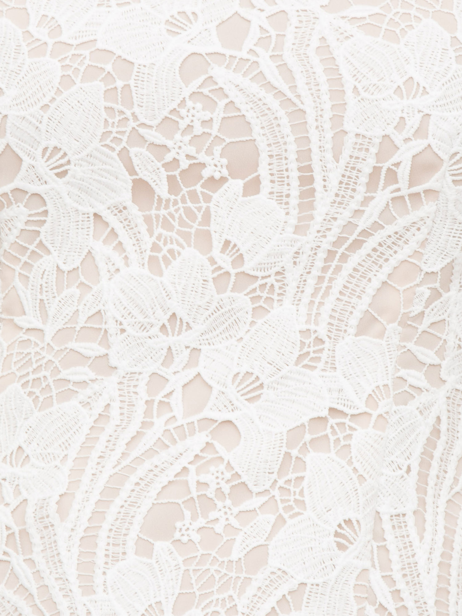 Abito midi a maniche corte della collezione Sogold, realizzato in tessuto di pizzo a fiori con effetto trasparenza.La modella è alta 1.72 e indossa la taglia S.