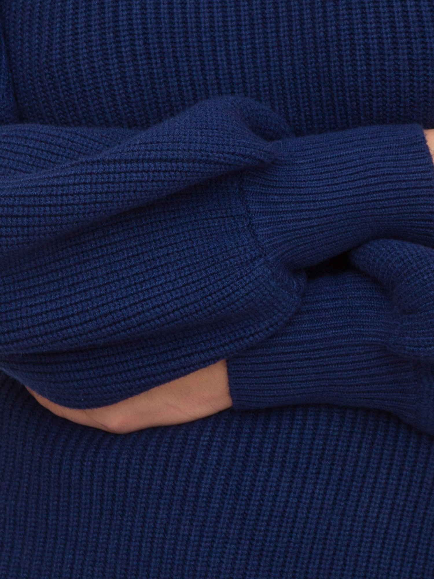 Abito avvolgente con maniche lunghe a palloncino blusanti e punto vita sottolineati da punti maglia in rilievo orizzontali.