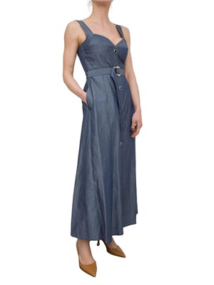 Abito lungo in misto lino, scollatura a cuore, sorretto da spalline, cintura sur ton con fibbia d-ring in abbinamento e chiusura con bottoni.