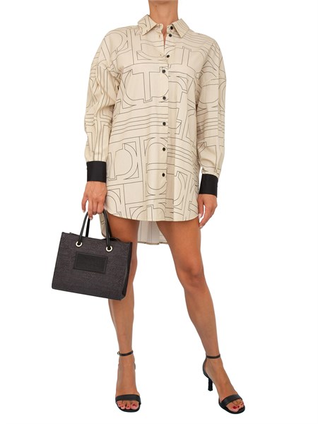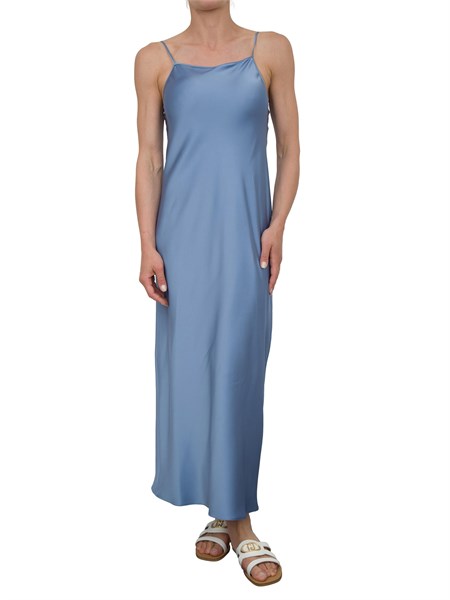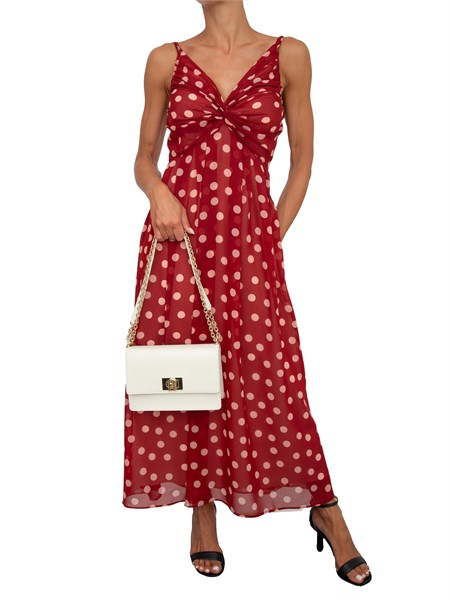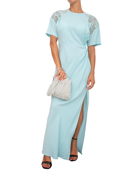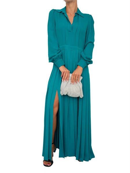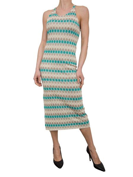 Vestito longuette al ginocchio realizzato in jersey indemagliabile, lavorato con una particolare tecnica che rende il tessuto particolarmente resistente e consente alla maglia di non disfarsi in caso di rottura. L'abito a maniche lunghe dalla linea bodycon, aderente al corpo, è costruito con un gioco di incroci discreti e arricci nella parte superiore, rimanendo più fluido sulla gonna. Lo scollo presenta una particolare costruzione a barchetta, che delinea la figura con un dettaglio design.